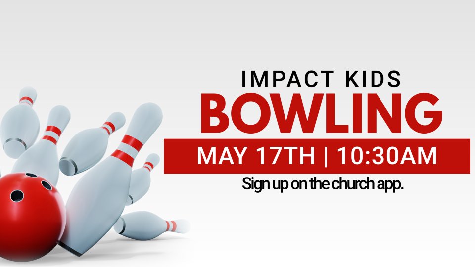 Kids 12 and under are invited to join us for bowling. Kids under 5 will need to be accompanied by an adult. We will leave the church at 10:30am and return at 12pm.
