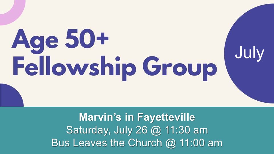 Are you 50 or older and looking for a fun and meaningful way to connect? Our lively Age 50+ Fellowship Group is heading to Marvin’s Buffet in Fayetteville. It’s the perfect chance to meet new people and