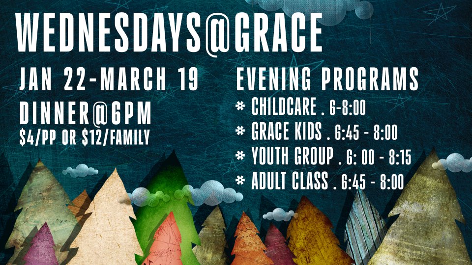 Join us Wed. nights, Jan 22 thru Mar 19 for dinner & class! We have something for all ages, so bring your family! Dinners are in the gym at 6p. Suggested: $4/pp or $12/family. Childcare Available: 6pm – 8pm (Main floor childcare) Grace Kids: Kinder through 5th grade 7:30-8p (2nd Floor) Youth Group: Grades 6-12 7:30-8:15 (Youth Room/Gym) Adult Class: 6:45-8p (Lounge) The Adult class this fall will be taught by Dennis Whitcher . Class will be held in the Lounge after dinner. We will not be meeting March 5th.