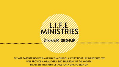 We will provide a meal at Maranatha Church every 2nd Thursday of the month for L.I.F.E Ministries. L.I.F.E Ministries is a Christ-centered addiction recovery program for both men and women. We will need 3 - 4 individuals or 1 - 2 families people to provide a meal together. Those that sign up will need to communicate what they will bring for that week. Contact Jessica Carawan for questions.