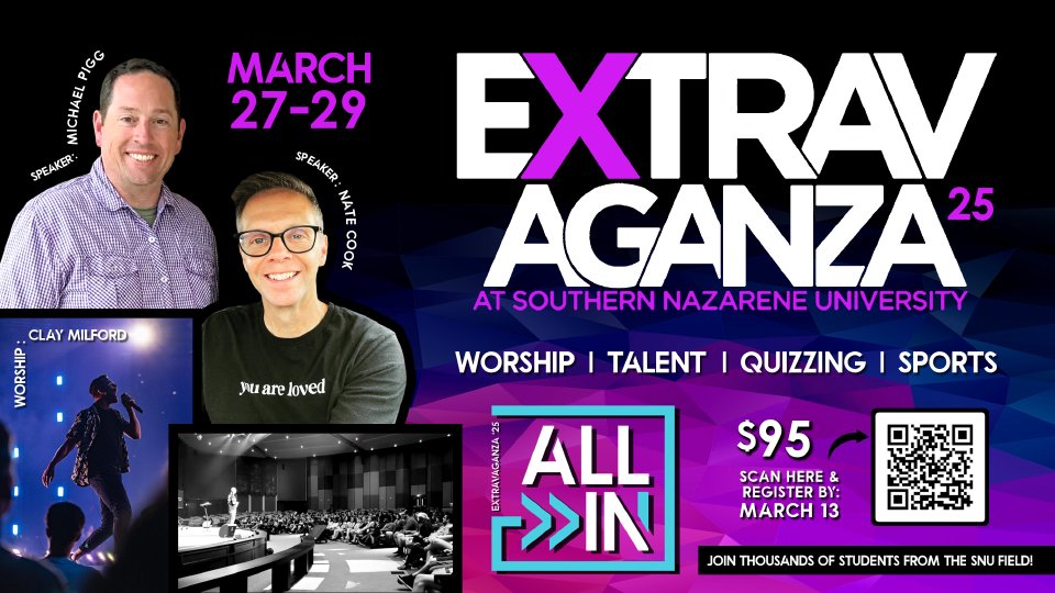 It's almost that time again! Please register for our upcoming 4-day trip to Southern Nazarene University in OKC. This is a weekend retreat for Nazarene Youth across the South Central Region of the US. Last year was fun and I am looking forward to being there with you this year again.