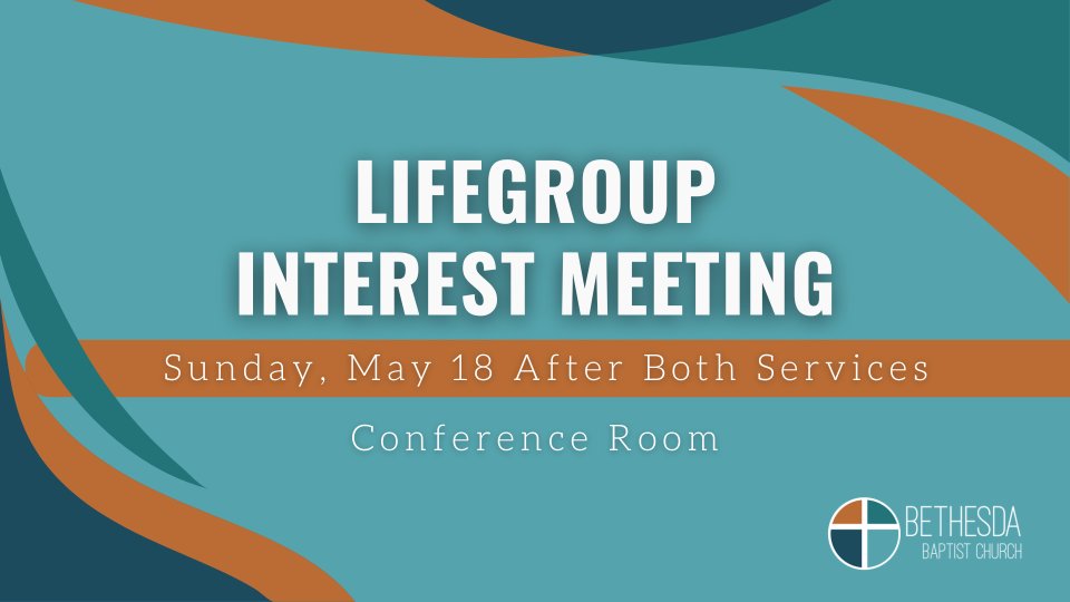 Are you looking for deeper connection and community at Bethesda? Join us for a LifeGroup Interest Meeting on Sunday, May 18, after both services in the Conference Room. Whether you're new to LifeGroups or just want to learn more about getting connected, this brief meeting is the perfect next step. We’d love to help you find your place to grow in faith and fellowship!