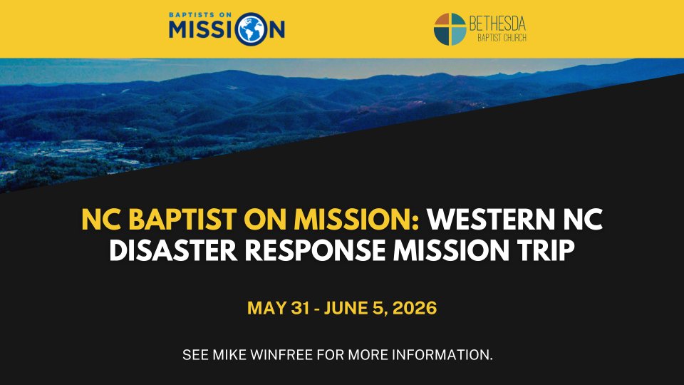 Mission team to help repair and rebuild homes in Western North Carolina that were damaged during Hurricane Helene. You don't have to have construction or repair experience to participate. If you are interested, please see Mike Winfree for more information.