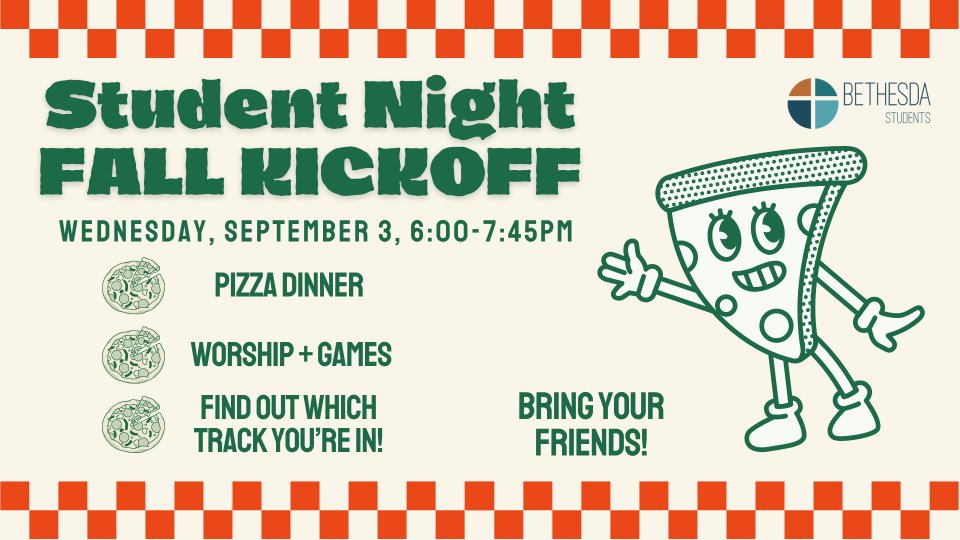 It’s time to launch into a brand new year of student nights—and we’re coming in hot! Join us for an unforgettable night as we kick off the fall semester with high-energy games, powerful worship, yummy food, and find out which track you'll be diving into this semester. Whether you’re returning or brand new, this is the perfect night to jump in, connect, and start the year strong. Bring a friend and let’s go!