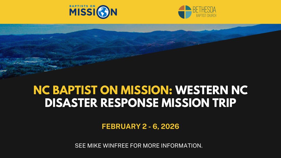 Mission team to help repair and rebuild homes in Western North Carolina that were damaged during Hurricane Helene. You don't have to have construction or repair experience to participate. If you are interested, please see Mike Winfree for more information.