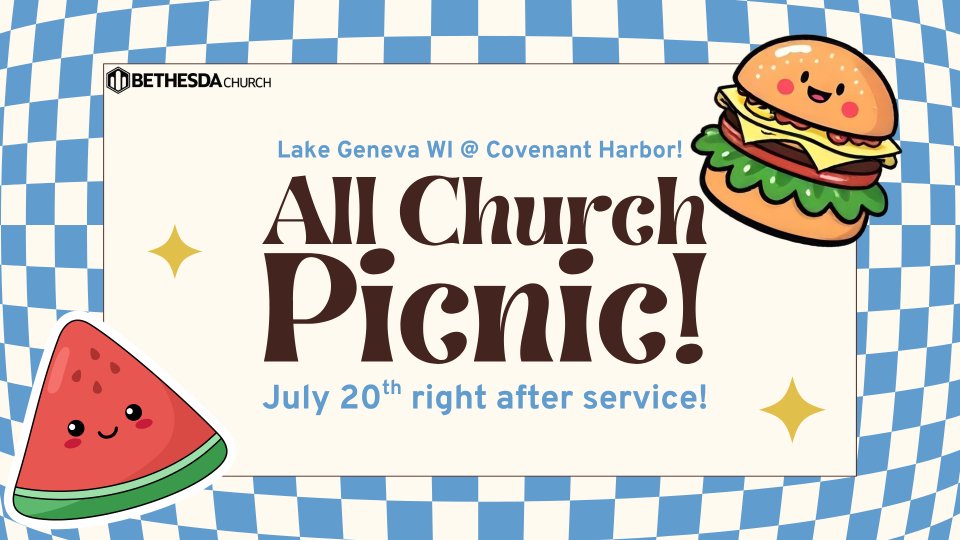 Everyone is invited! Right after service on July 20, drive up to Covenant Harbor in beautiful Lake Geneva and enjoy a potluck picnic with us! The waterfront will be open, so make sure to bring your swimsuits!