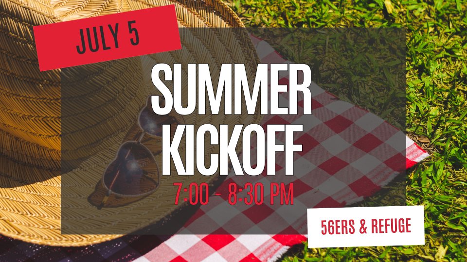 Every Saturday night this summer, we gather as Grade 5-12 for church. Join us at 6:00 pm for singing, teaching from the Bible, prayer, and a great time with others. The service is one hour in length.