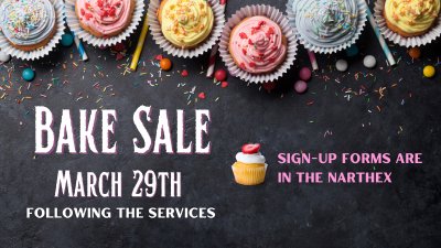 Bake sale is coming up on March 29th! Our Bake Sale will be held following both services.