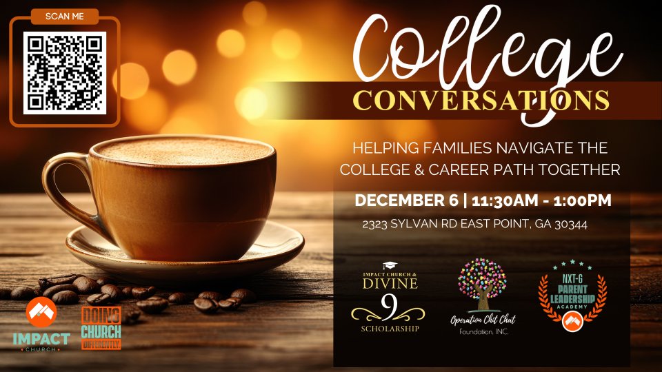Session 1 is Setting Intentions & Defining Success. Seniors that will apply for Impact Church Scholarships will be required to attend at least two (2) College Conversation sessions between December and March to qualify for the 2026 Impact Church & Divine 9 Scholarship. Each session will offer relevant insights on academic readiness, personal growth, leadership, and faith-based purpose.