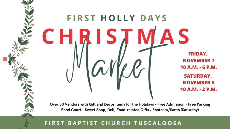 This is also a great way to serve! Contact Beth Yates (byates@fbctuscaloosa.org) to volunteer before, during and/or after this event. We need people to help with setup, cleanup, security, greeting, sweet shop and deli crew, information booth, and more!