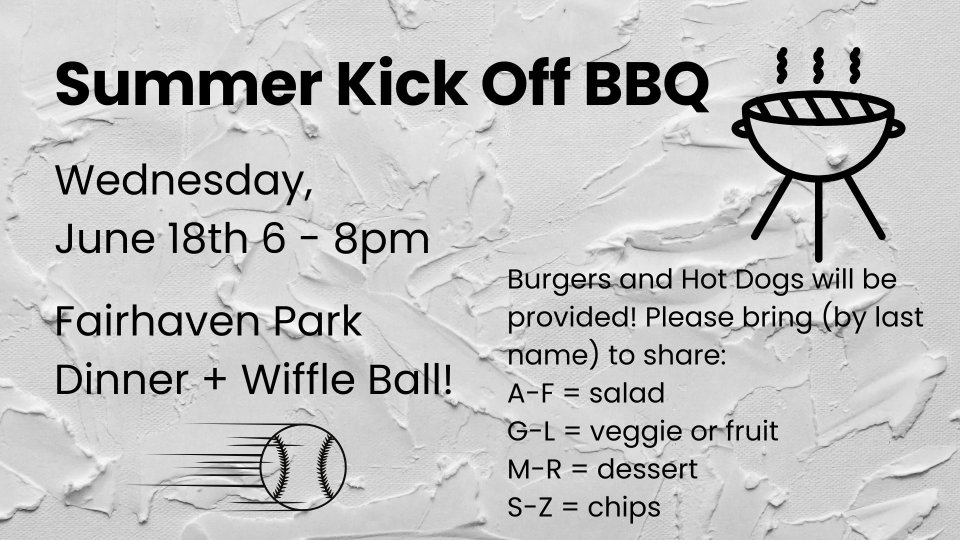 Let's celebrate the start of summer right! Join us for an all-church BBQ, potluck and wiffle ball game!