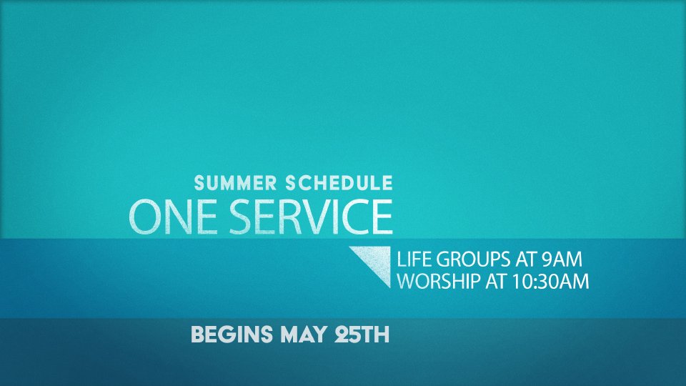 On Sunday mornings this summer we will have one Life Group at 9:00am and one Worship Service at 10:30am. Check with your Life Group leader to find out if your group will change locations for the summer.