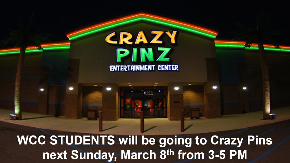 WCC STUDENTS will be going to Crazy Pins today from 3-5 PM