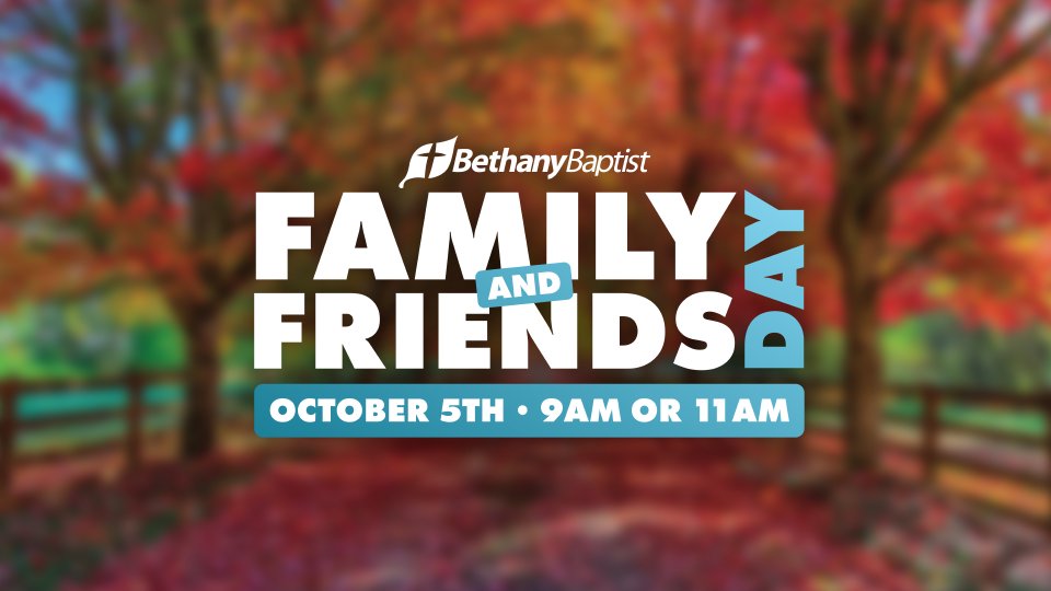 We'd love to invite you and your crew to join us here at Bethany! Family & Friends Day is a special time to connect, be encouraged, and enjoy worship together. Whether you're bringing a neighbor, a friend, or the whole family, you'll find a warm welcome and a place to belong. You can choose from two services, 9AM or 11AM, and experience what makes Bethany such a great part of our community. We can't wait to see you there!
