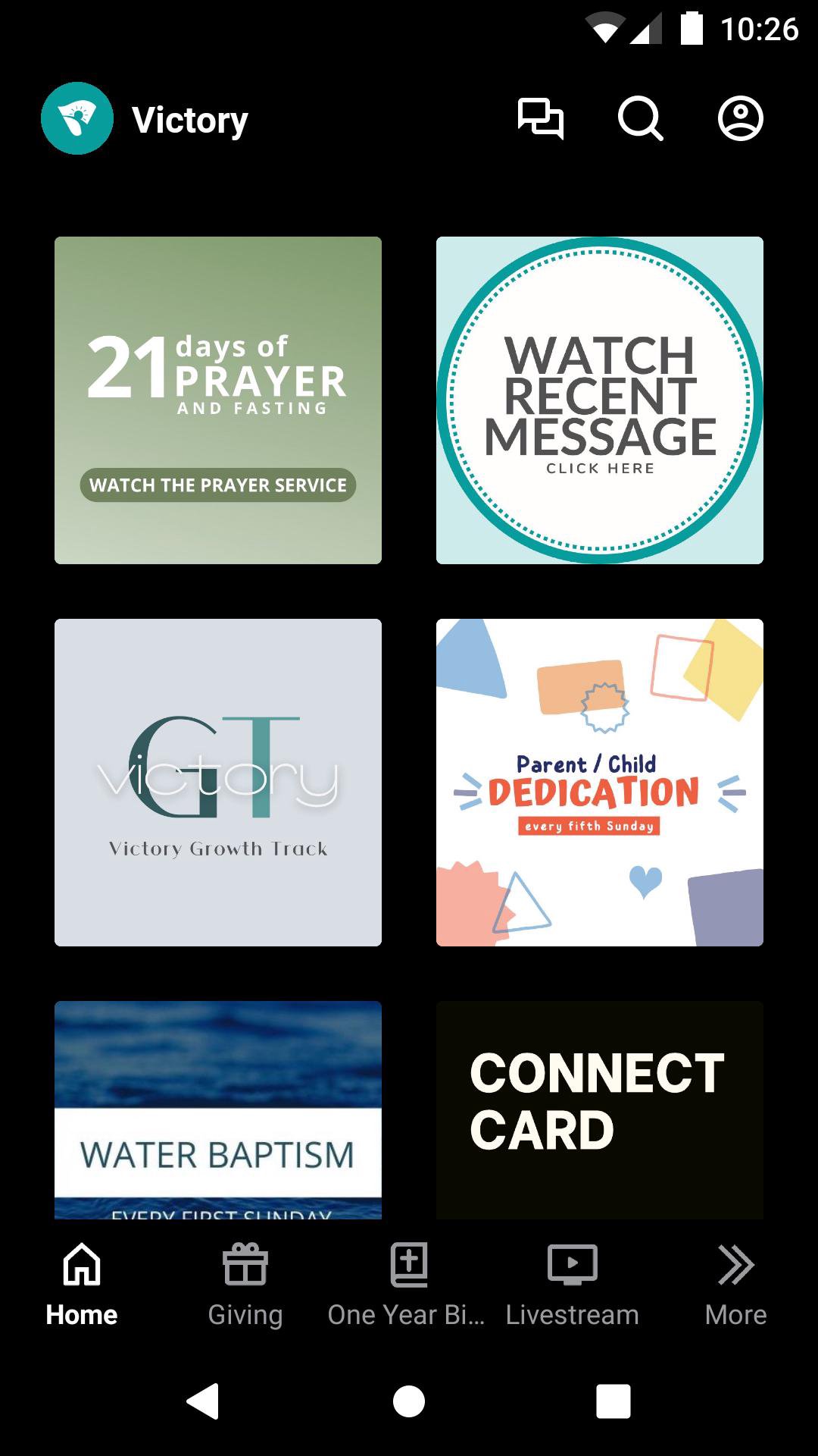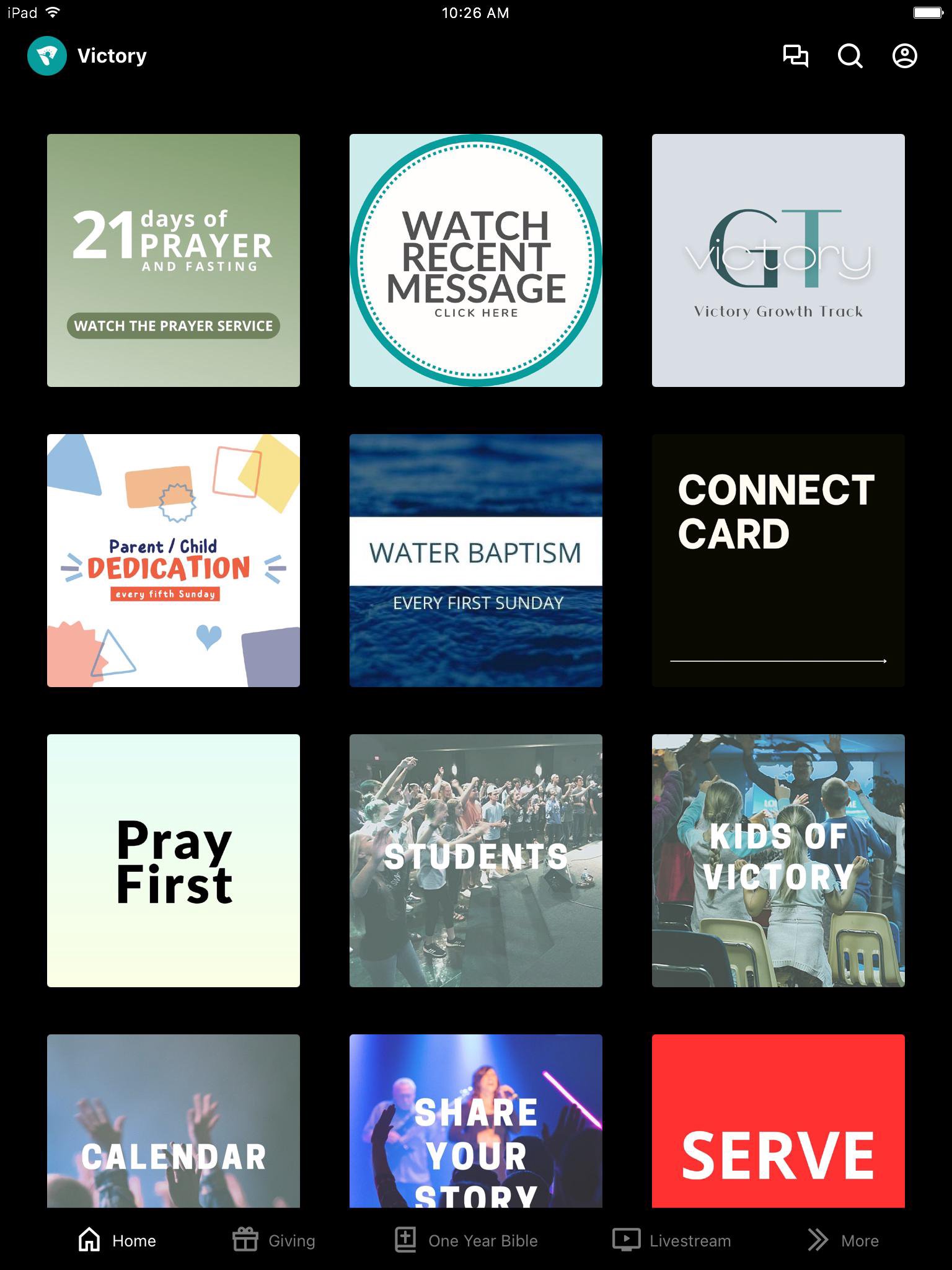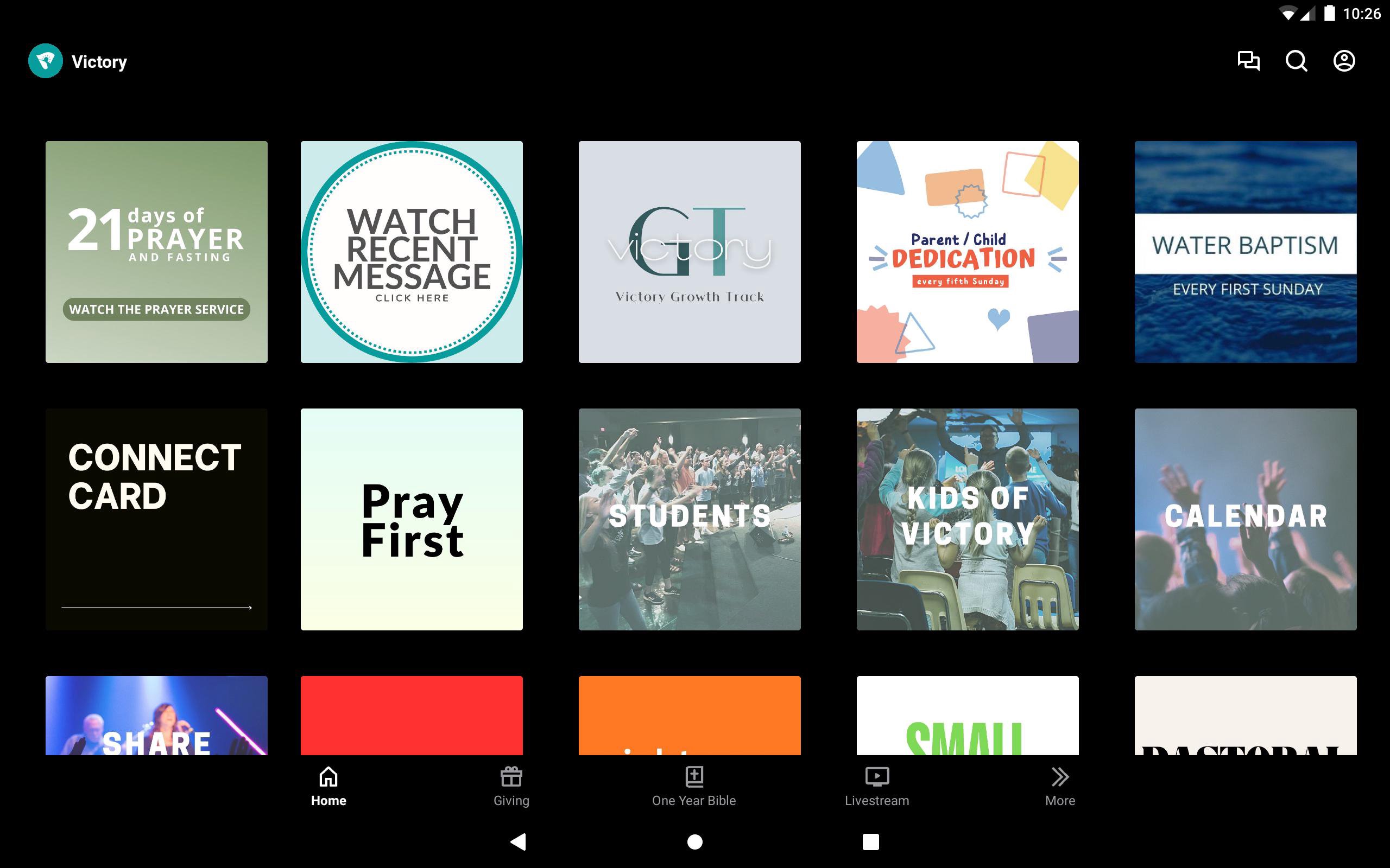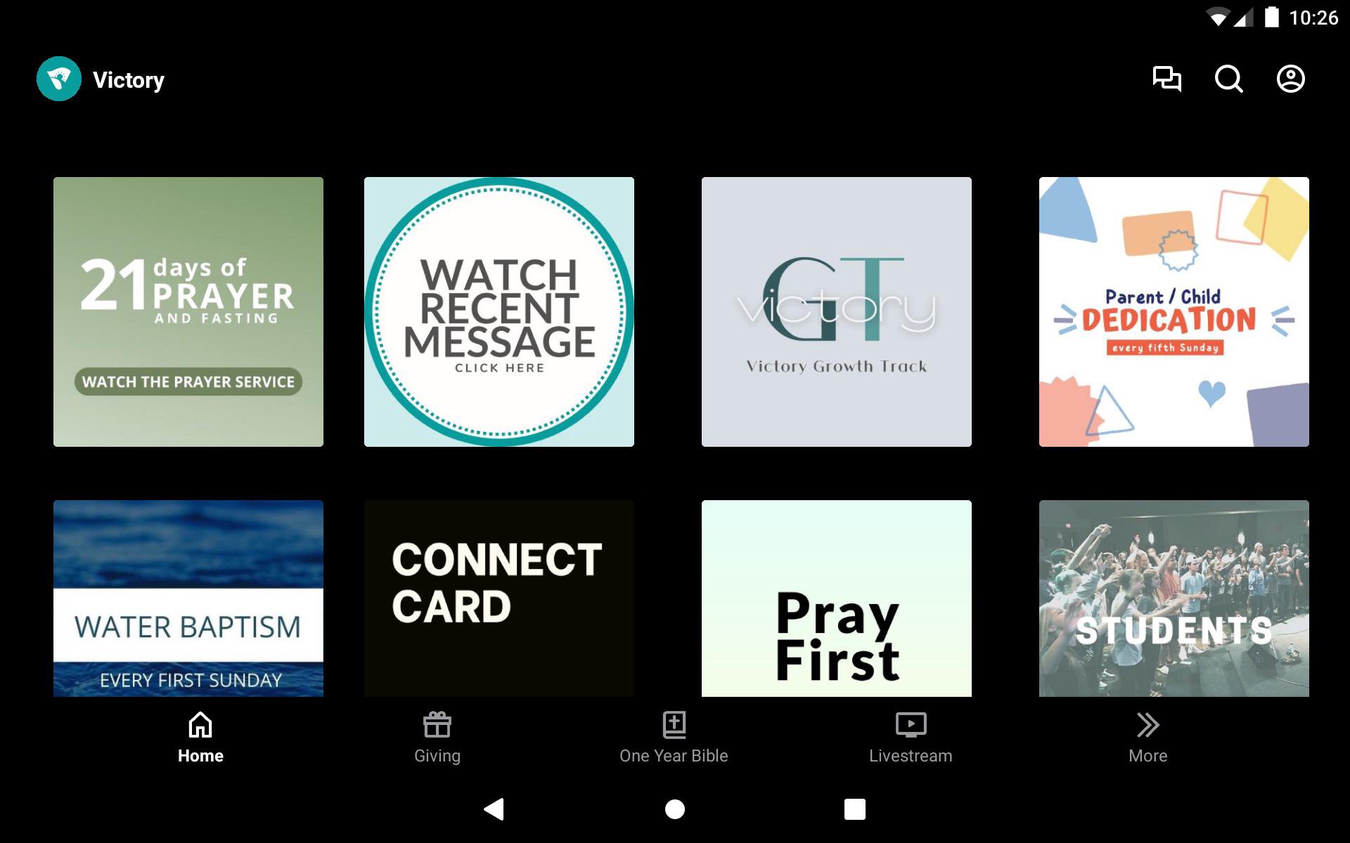 The Victory app will help you stay connected with the day-to-day life of our church. With this app you can: - Watch or listen to past messages - Stay up to date with push notifications - Share your favorite messages via Twitter, Facebook, or email - Download messages for offline listening