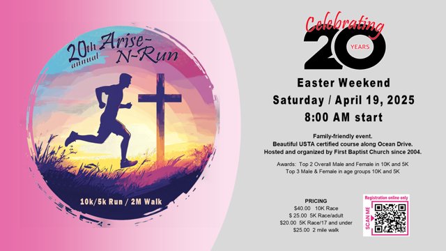 Register for our 20th running of the Arise-N-Run race the Saturday before Easter. This family-friendly event races along Ocean Drive on a USTA certified course.