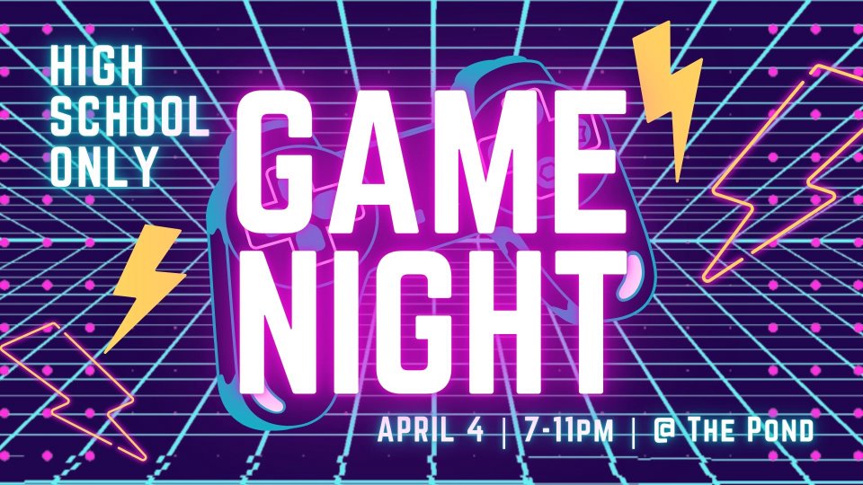 This high school-only event will feature all kinds of games—board games, video games, large group games, and more! Food will be provided, and it’s a night you won’t want to miss.