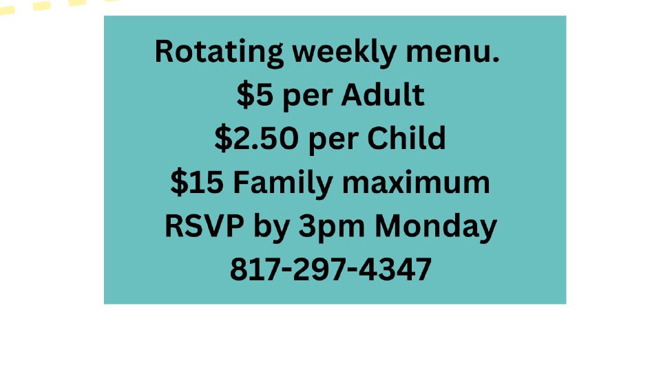 Please call the church office (817)297-4347 to RSVP by 3pm each Monday. $5 per Adult, $2.50 per child. Family max $15