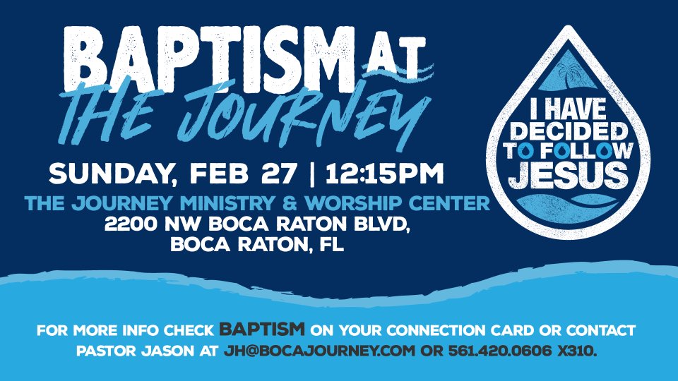 You're invited to be baptized on Sunday, February 27 at 12:15pm-12:45pm at our Ministry & Worship Center. This will be an unforgettable experience! The Bible teaches that every person, once they become a follower of Jesus, should be baptized. And if you're a follower of Jesus, but haven't yet been baptized as a believer in Jesus, then Baptism is your next step. Acts 22:16 declares... "What are you waiting for? Get up and be baptized. Have your sins washed away by calling on the name of the Lord.’" Click below to complete the form and RSVP, or email Rachel at baptism@bocajourney.com or call 561.420.0606 x302.
