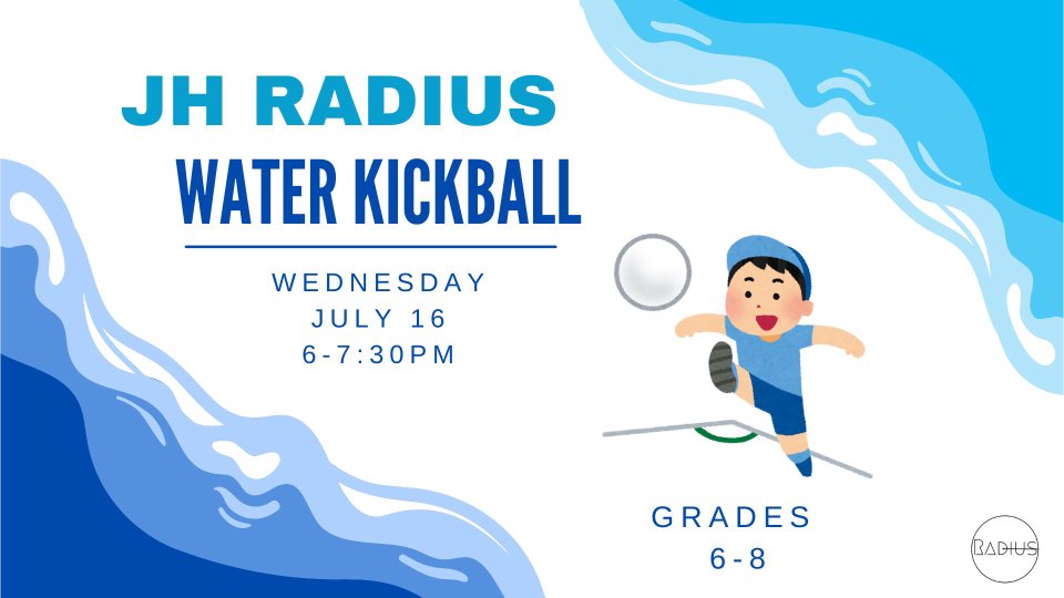 Prepare for a competitive game of Water Kickball. Bring a towel and clothes to get wet in. This event is for incoming sixth graders through eighth grade. We will be having snowcones and nachos alongside this friendly competition.
