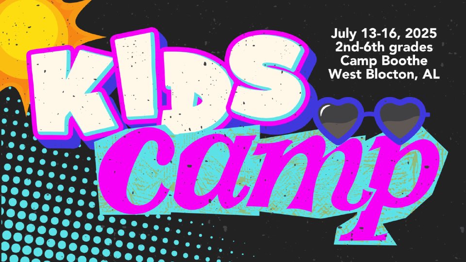 Join us for Kids Camp Sunday July 13th-July 16th at Camp Boothe in West Blocton, Alabama! A $50 deposit will be required to lock your child's spot in for camp. You can pay your balance in installments if necessary. If you have any questions, please speak with Pastor Meredith!