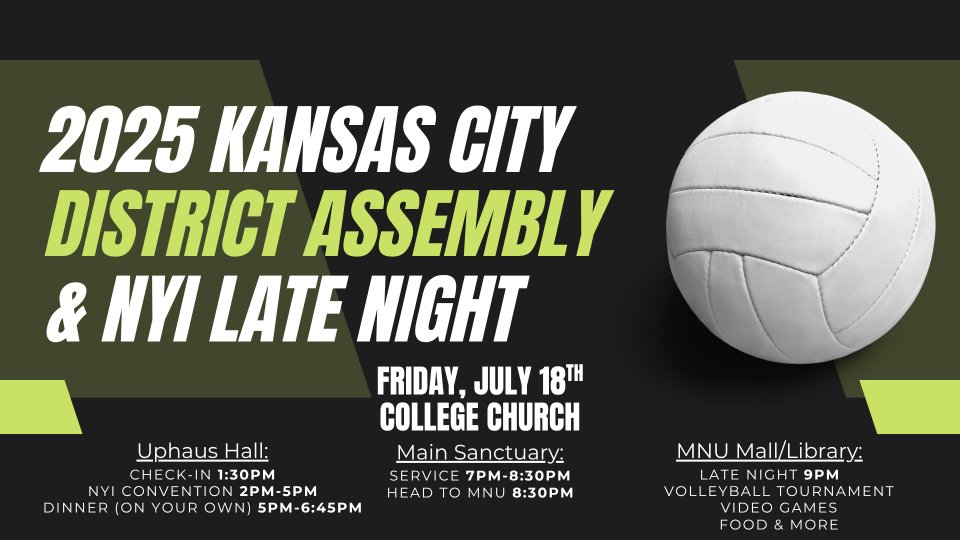 Join us as we gather with our district friends, celebrate the fun we had all year, and look to where we're going next year. We'll worship and play games together, and then head to MNU for our late night event where there will be free pizza, games, and our annual Volleyball Tournament! You MUST REGISTER for this event.