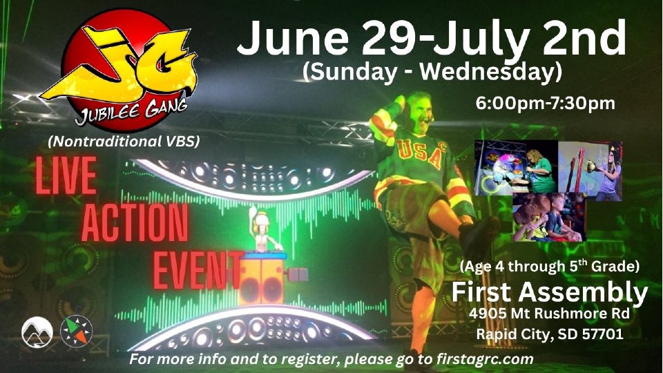 The Jubilee Gang (Nontraditional VBS) is a fast pace, multi-media experience, your kids won't want to miss. There will be lights, video, special effects, games, puppets, prizes, treats and more. The Jubilee Gang (Nontraditional VBS) will be here Sunday, June 29th, - Wednesday, July 2nd, from 6:00pm-7:30pm. It is for children Age 4 - 5th Grade (grade just coming out of).