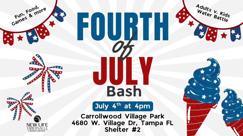 Come out to our 4th of July Bash! This church fellowship event at the park promises a day filled with food, fun, and games for all ages. We'll also have water festivities, so be sure to dress accordingly if you'd like to participate and get wet! The celebration concludes with a dazzling firework show at NLT Carrollwood at 8 PM. Everyone is welcome!