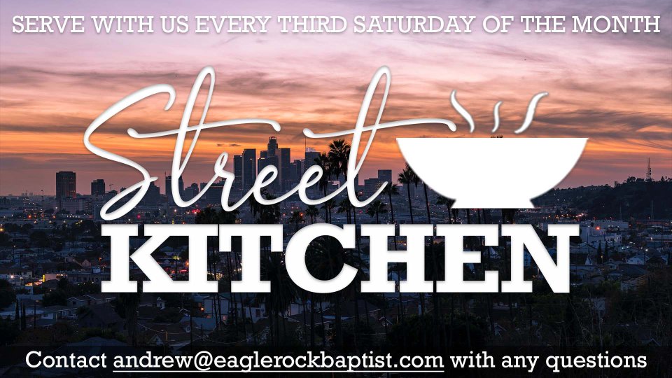 On the 3rd Saturday of every month, Street Kitchen prepares and serves a hot breakfast in Jesus’ name to those experiencing homelessness in downtown Los Angeles. Come be a part of a ministry that witnesses Christ’s love in both word and deed to those in Los Angeles who experience homelessness, our neighbors who are in need of extra care and love! If you have any further questions or want to sign up to serve, contact Pastor Andrew at andrew@eaglerockbaptist.com.