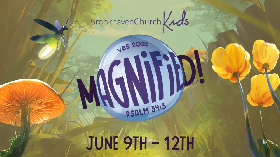 Brookhaven's VBS will be a captivating week of music, dancing, crafts, and recreation that will give your child the opportunity to start laying the foundation for a lifetime of knowing Jesus! Magnified! VBS will encourage kids to look closely at the details of God’s amazing world and magnify, or proclaim, the greatness of God. God made us, cares about us, loves us, forgives us, and is faithful to keep all His promises to us. We can praise God together! We were made to magnify God!