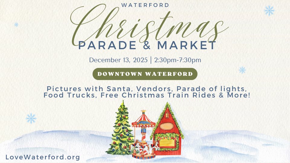 Come on down to downtown Waterford and check out our vintage inspired village with free Christmas train rides, hot cocoa, and fun games! Join us in community and celebrating this Christmas season!