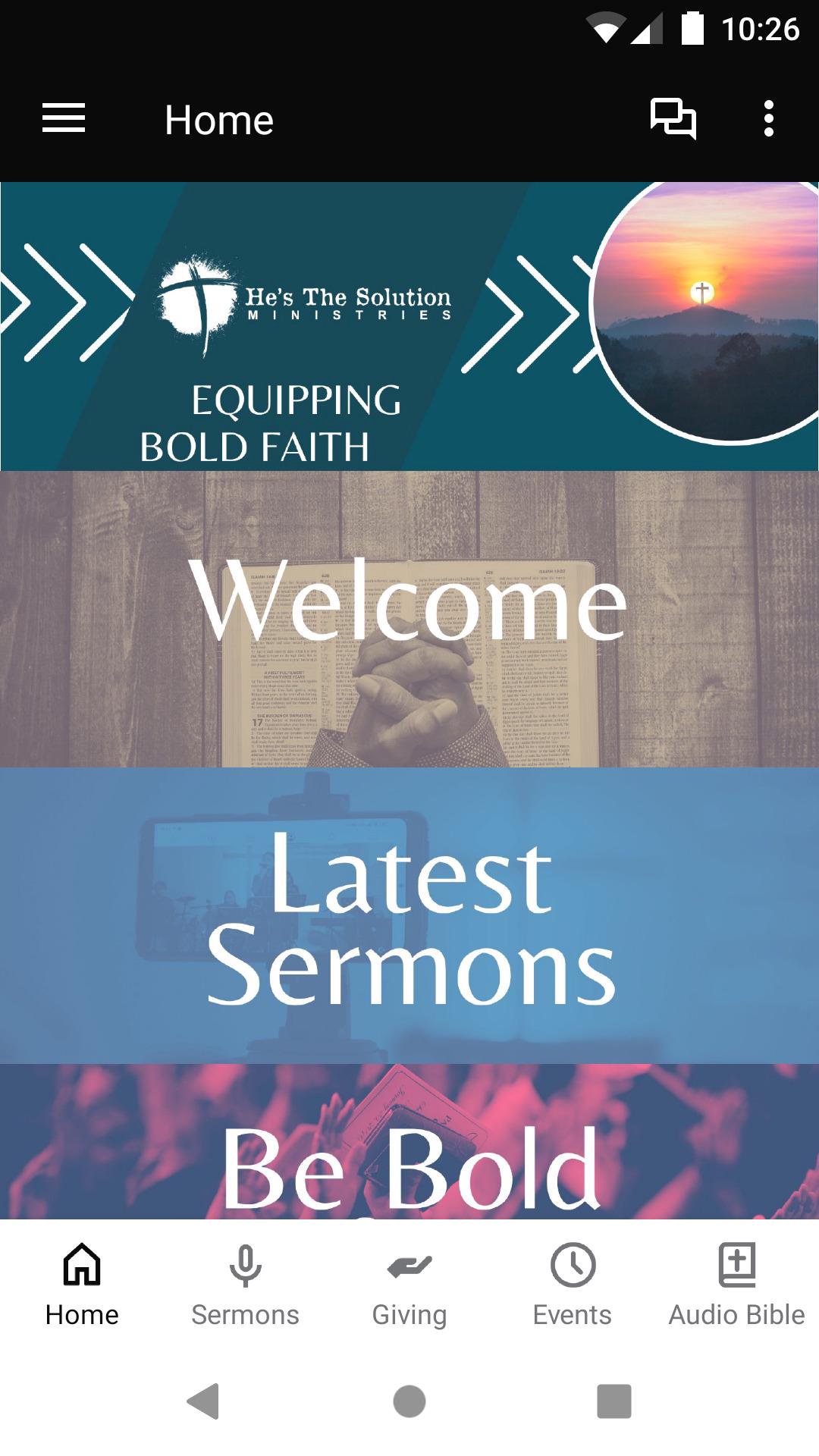 He's the Solution Ministries App will help equip you with the tools you need to have bold faith wherever you are: ~ Watch the latest recorded Sunday Sermons ~ Be encouraged with our Boldness Blog ~ Uplift one another through our Messaging Feature ~ Be a part of A Prayer Group