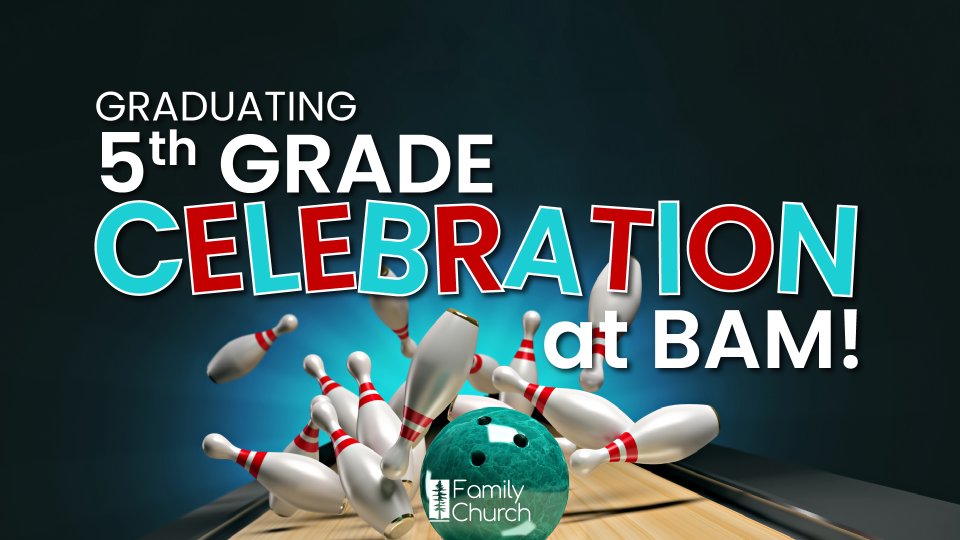 Calling all 5th-grade graduates! Family Students and Family Kids are excited to host a night of fun at BAM! on Wednesday, June 4, from 5:30 to 7:30 p.m. You can say thank you and goodbye to some of your favorite 5th-grade teachers and meet Pastor Grant and many of the Family Student leaders. Registration is free and includes, bowling, pizza, drinks, games, and laser tag. Register by June 3.