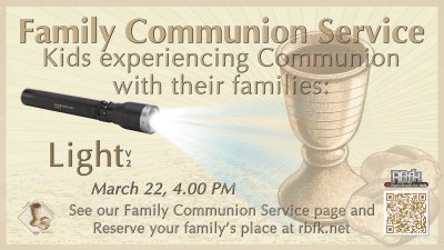 We'd love to provide you with an opportunity to experience communion as a family among other families. Join us at the elementary room in the east building, March 22 at 4:00 PM. Register below! For more information, visit https://www.rbfk.net/family-communion-service.html