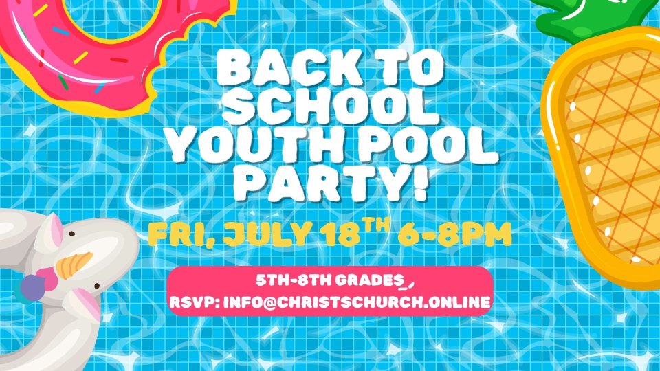 The Youth (5th-8th graders) Back to School Pool Party will be Friday, July 18th from 6-8pm. Please RSVP at info@christschurch.online and the address will then be provided. Thanks!