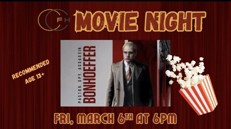 If you aren't familiar with this historical figure, Dietrich Bonhoeffer, was a pastor, spy, German theologian and he was anti-nazi. This movie shows his moral struggles and involvement in a plot against Adolf Hitler. Due to the serious nature of this film, we recommend teens & above. Hope to see you there! (FREE POPCORN & ADMISSION)