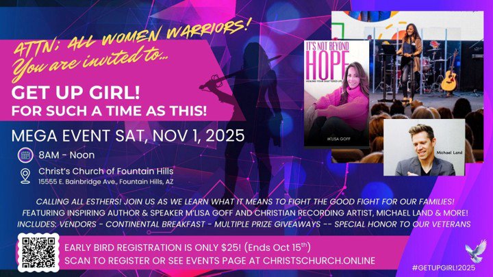 Join women from all over the valley, in beautiful Fountain Hills, Arizona, as we learn about being incredible women warriors, for such a time as this! Featured inspirational speaker & Author, M'Lisa Goff will be joining us, as well as Christian Recording Artist, Michael Land & Lizzy. Dee Pavia and Monique Moody from Get Up Girl! Women's Ministry will also be on board, as well as our wonderful vendors & featured support groups. Admission includes: Continental breakfast, amazing prize giveaways & free gifts! Meet new friends, enjoy worship, teaching & powerful prayer, all-in-one! You don't want to miss out on this incredible experience! Register soon! Cost is only $29.99pp. For group discounts (5+more), email: info@christschurch.online