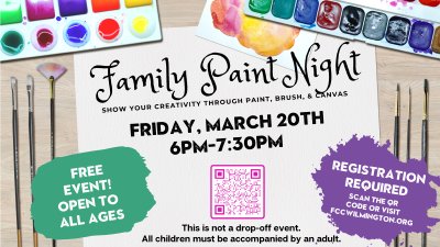 If you’re looking for a family-friendly activity that doesn’t involve a screen then step away from the devices and bring the whole crew to the Family Paint Night at FCC! You don’t need to be an artist to have fun! This event is about creating fun art, not fine art. So, whether your kiddos are holding a paintbrush for the first time or grandma’s brushing up on her past hobby, there’s something for everyone to enjoy at our Family Paint Night! Our Family Paint Night will have step-by-step instruction designed for all ages and skill levels. Get the whole gang together for our Family Paint Night and spend some time creating memories in a relaxed, creative atmosphere. Everyone in your crew will have a blast unleashing their creativity and learning a brand new skill. We want you to focus on what's important—having fun, making memories, and building relationships! Enjoy time with your favorite people, and let us take care of all the details—including messes and supplies, snacks, and drinks. Plus, everyone will leave with one-of-a-kind keepsakes created with a whole lot of love – and probably a whole lot of laughter, too! Organizing a family outing that's fun for loved ones of all ages can be tricky! Our Family Paint Night is your answer to this dilemma. From your littlest youngster to teenagers and beyond, everyone will love rolling up their sleeves and getting artsy. This event is free to attend for all ages. REGISTRATION REQUIRED - This event fills up fast so be sure to register early. This is not a drop-off event. All children must be accompanied by an adult or guardian over 18 years of age.
