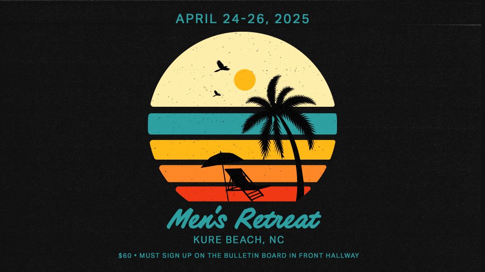 Signups are underway for the Men's Kure Beach Retreat, April 24 - April 26! (Signup on the bulletin board in the front hallway.) The cost is $60. For more information contact info@covenantbaptist.cc