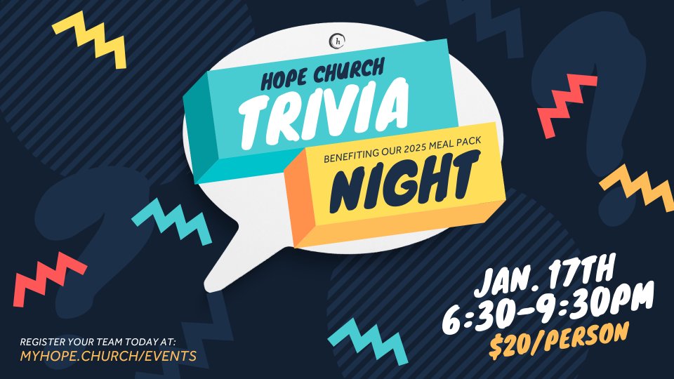 Join us on Friday, January 17th, from 6:30-9:30pm for an exciting Trivia Night benefiting our Hope 2025 Meal Pack!