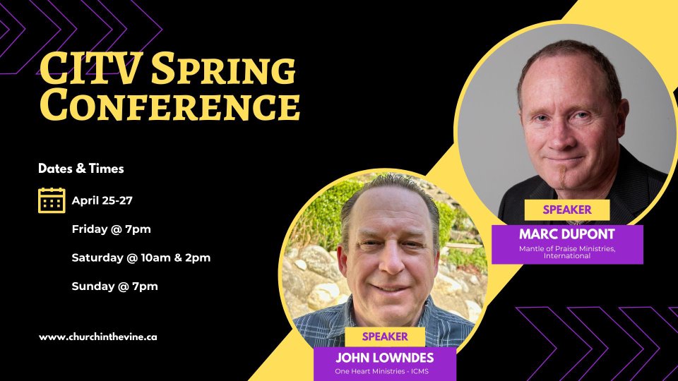 Join us at Church in the Vine for our Spring Conference from April 25β27, a powerful time of worship, teaching, and renewal! We are honoured to welcome guest speakers Marc Dupont and John Lowndes, who carries a strong prophetic and teaching ministry. Come expectant for fresh revelation, spiritual breakthrough, and a deeper encounter with God!