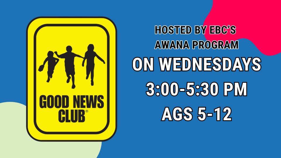 EBC's AWANA program is hosting a Good News Club weekly on Wednesdays from 3:00 to 5:30 pm. If you are interested in volunteering at GNC, please contact Angie Neal, the Coordinator, and click the appropriate links below.