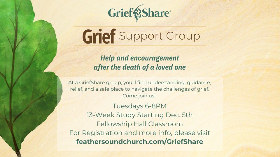 GriefShare is a grief recovery support group, a safe place where hurting men and women can find hope and healing after the death of a loved one. Our support group ministry is facilitated by dedicated volunteers from Feather Sound Church who have experienced and understand the heartache of grief. The group time consists of videos, discussion, and participant workbooks that guide group members through each session. The 13 videos feature respected Christian counselors and teachers who share insights and testimonies of God’s mercy and grace, plus personal testimonies from people who have experienced the loss of a loved one. GriefShare 13-week series begins 12/05/23 to 02/27/24 and will meet in the fellowship hall classroom at Feather Sound Church from 6:00pm to 8:00pm. Mary Anderson is our GriefShare lead representative at Feather Sound Church.
