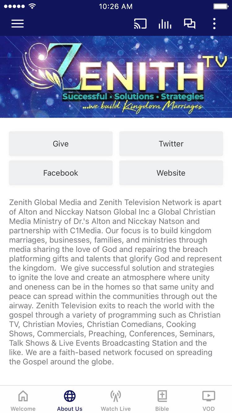 Zenith Global Media and Zenith Television Network is apart of Alton and Nicckay Natson Global Inc a Global Christian Media Ministry of Dr.'s Alton and Nicckay Natson. Our focus is to build kingdom marriages, businesses, families, and ministries through media sharing the love of God and repairing the breach platforming gifts and talents that glorify God and represent the kingdom. We give successful solution and strategies to ignite the love and create an atmosphere where unity and oneness can be in the homes so that same unity and peace can spread within the communities throughout the airways. Zenith Television exits to reach the world with the gospel through a variety of programming such as Christian TV, Christian Movies, Christian Comedians, Cooking Shows, Commercials, Preaching, Conferences, Seminars, Talk Shows & Live Events Broadcasting Station and the like. We are a faith-based network focused on spreading the Gospel 365 days a year, 24 hours a day, and 7 days a week throughout the globe.