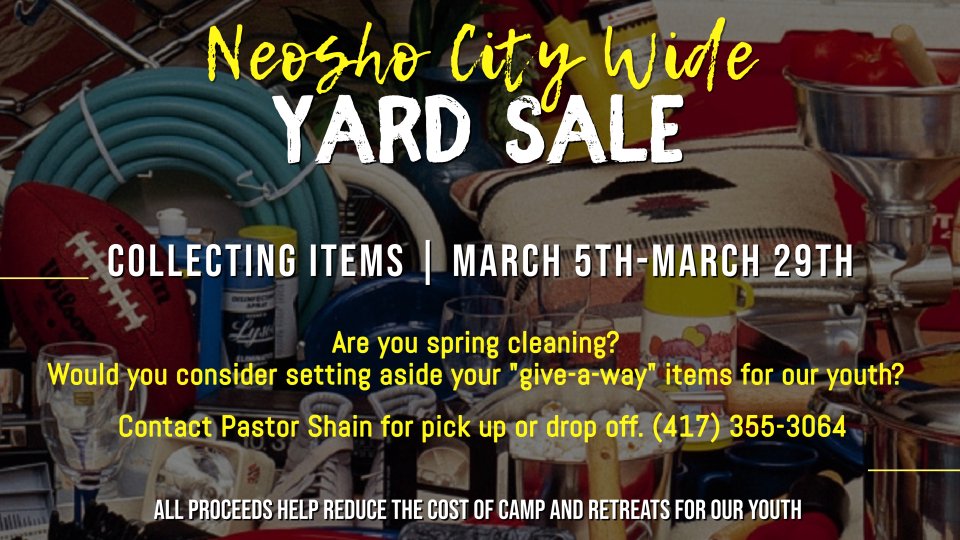 We're collecting items from March 5th - March 29th. Contact Pastor Shain for pick up or drop off. (417) 355-3064