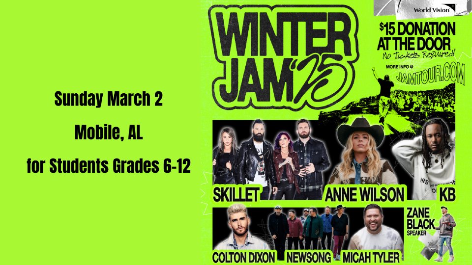 Students Grades 6-12 will be able to go to Winter Jam, a concert featuring Skillet, Anne Wilson, KB and more. There'll be worship and a speaker.