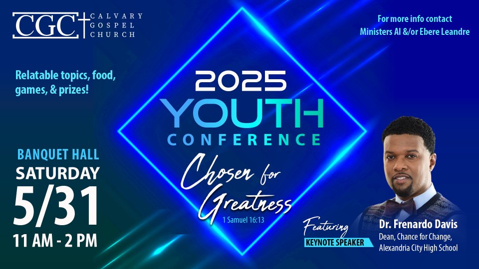 This annual conference brings together teens from Calvary Gospel Church and the surrounding community for a powerful time of inspiration, motivation, and personal growth. Designed to cultivate both strong character and spiritual development, the event aims to shape attendees into responsible citizens and devoted followers of Christ. The conference will feature dynamic presentations and engaging round-table discussions led by teens, young adults, and seasoned leaders alike.