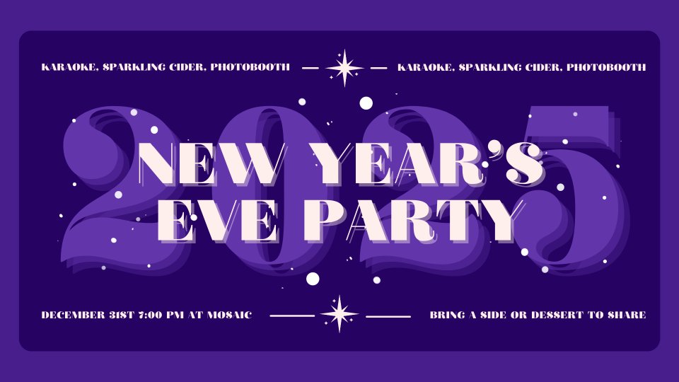 Ring in the New Year with Mosaic! You're invited to the church to celebrate the end of the year in a safe environment. There will be karaoke, a photobooth, and lots of fun had by all, then we'll watch the ball drop at midnight. If you plan to come, please register and let us know what dish you'll be bringing with you. It can be an appetizer/side dish, dessert, or soft drinks to share.