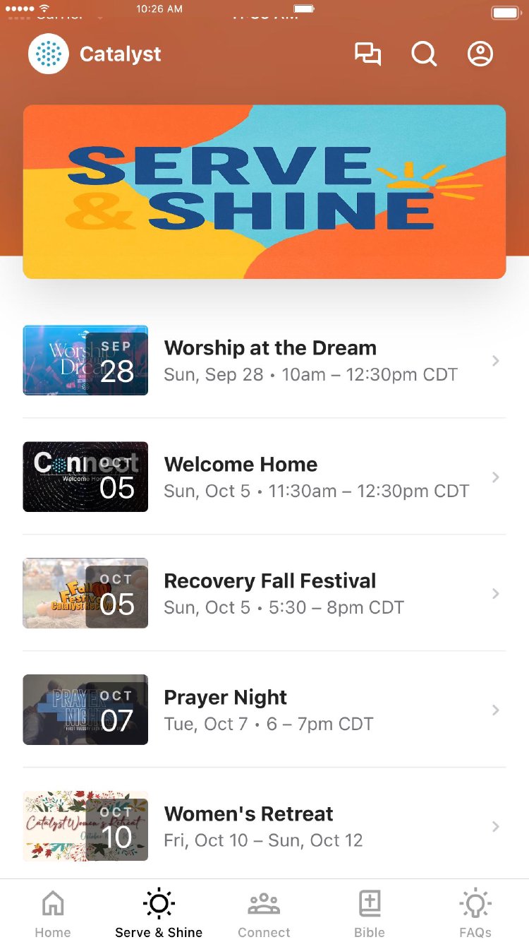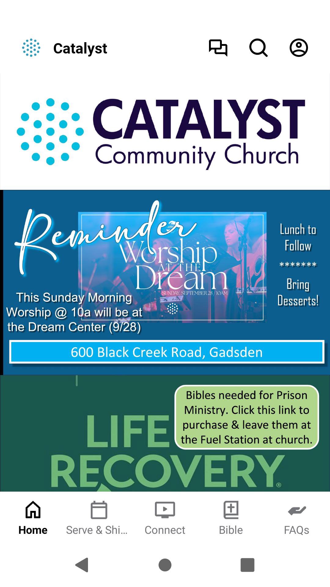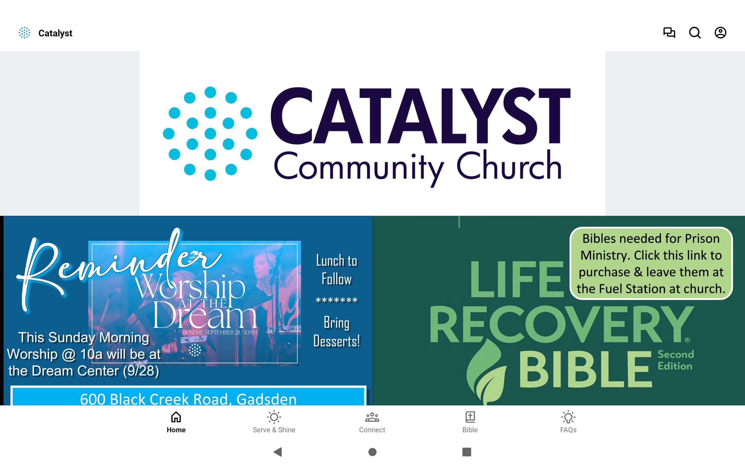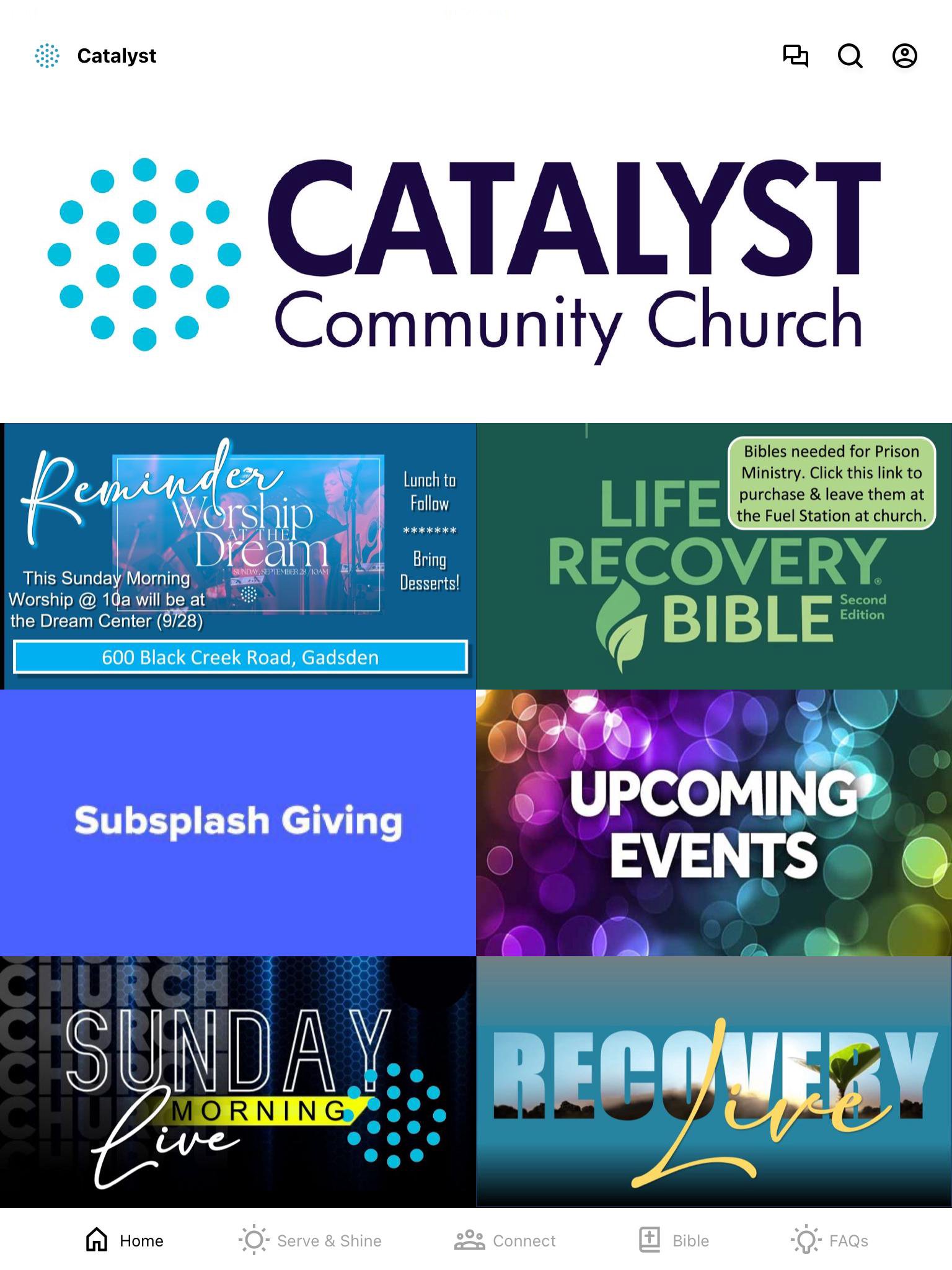 This app will help you stay connected with the day-to-day life of our church. Catalyst Community Church is a dynamic church located in Gadsden, AL. Our beliefs are based on the Bible and centered on Jesus Christ. That means we’re not about a building or some complicated religious system, but about helping people from all backgrounds discover the joy that comes from knowing and serving Jesus Christ. With this app, you can watch or listen to past messages, stay updated with push notifications, read the Bible, and view our calendar.