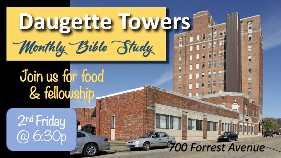 We go to Daugette Towers every month on the 2nd Friday and have a Bible Study with the residents. Of course we eat, play games, and do crafts. Come join in on the fun!